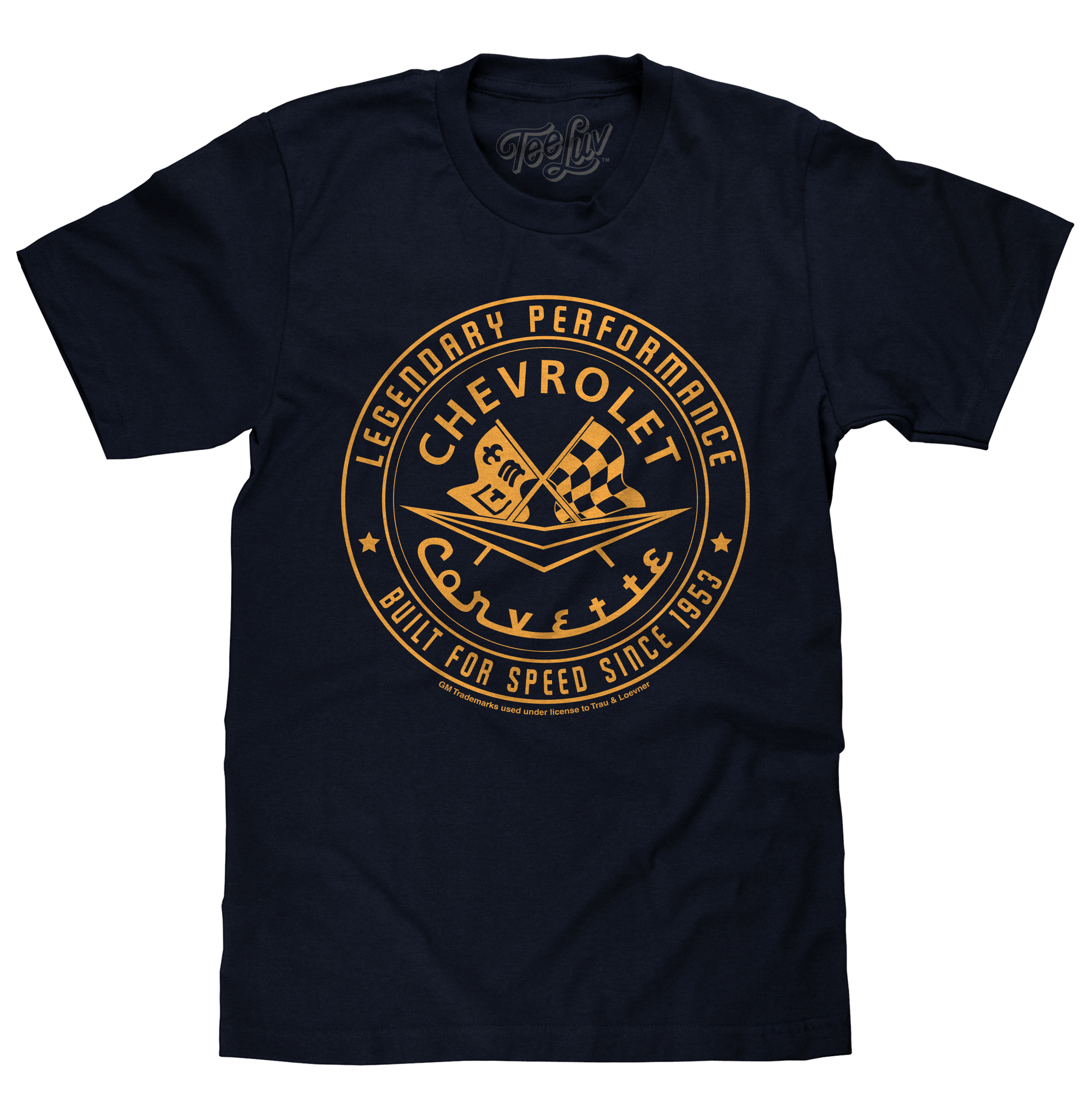From late night drives to weekend meetups at the track - the stylish Chevrolet Corvette is engineered for performance. Inspired by America's favorite sports car, the Tee Luv team crafted this subtle automotive shirt featuring the Chevrolet Corvette signature script and crossed flags emblem, surrounded by "Legendary Performance" and "Built For Speed Since 1953" text. Printed on a soft, navy blue cotton tee - this Chevrolet Corvette t-shirt is perfect for cruising, car shows, or just everyday wear!