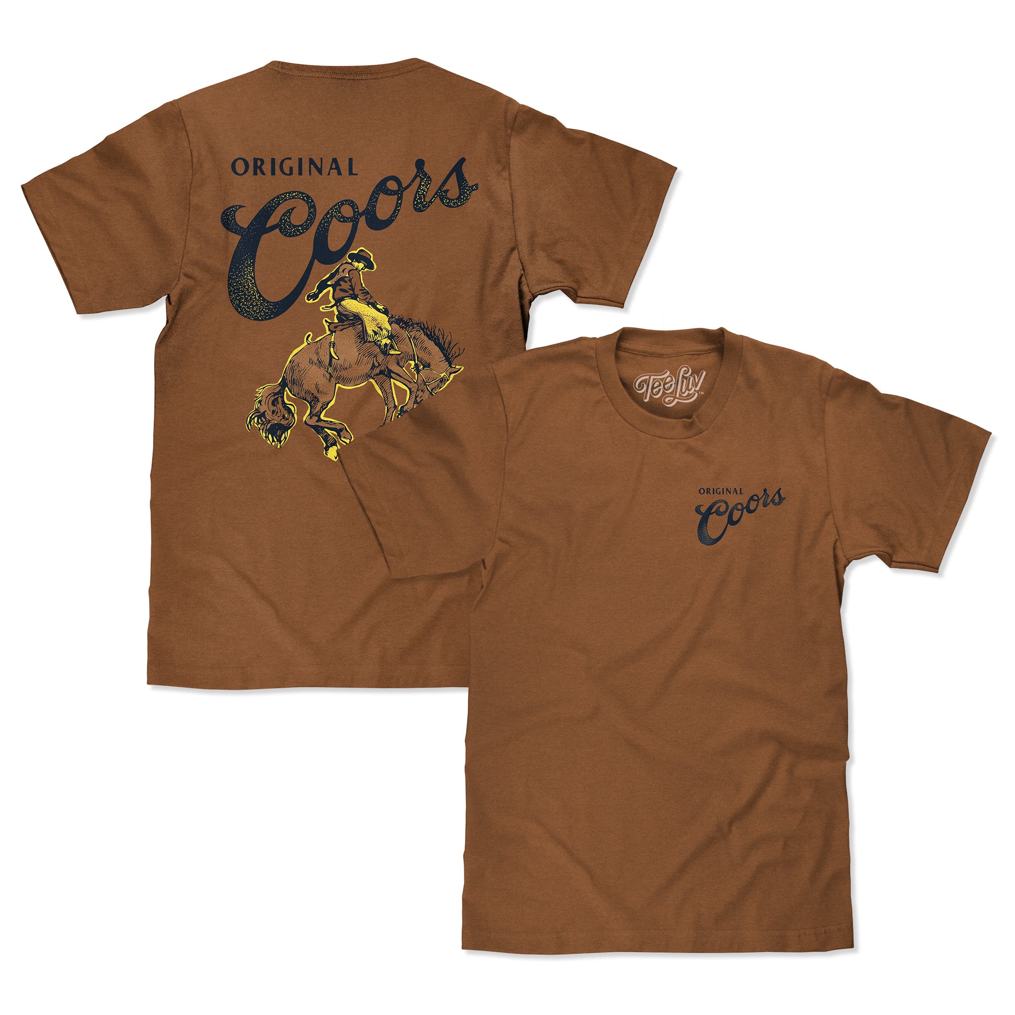 Forgive the pun, but when it comes to crafting a comfy beer shirt: It ain't our first rodeo! Inspired by the rugged American West history of the Coors brand, and their long standing support of rodeo - the Tee Luv team went straight to work combining the best of both worlds into one bold graphic tee. We've featured the "Original Coors" text logo on the front left chest, and a full-sized version of logo on the back along with a graphic of a cowboy riding a bucking bronc. To tame this Coors beer brand shirt - we've distressed the graphic, and printed it on a soft, Brown Sugar cotton tee.
