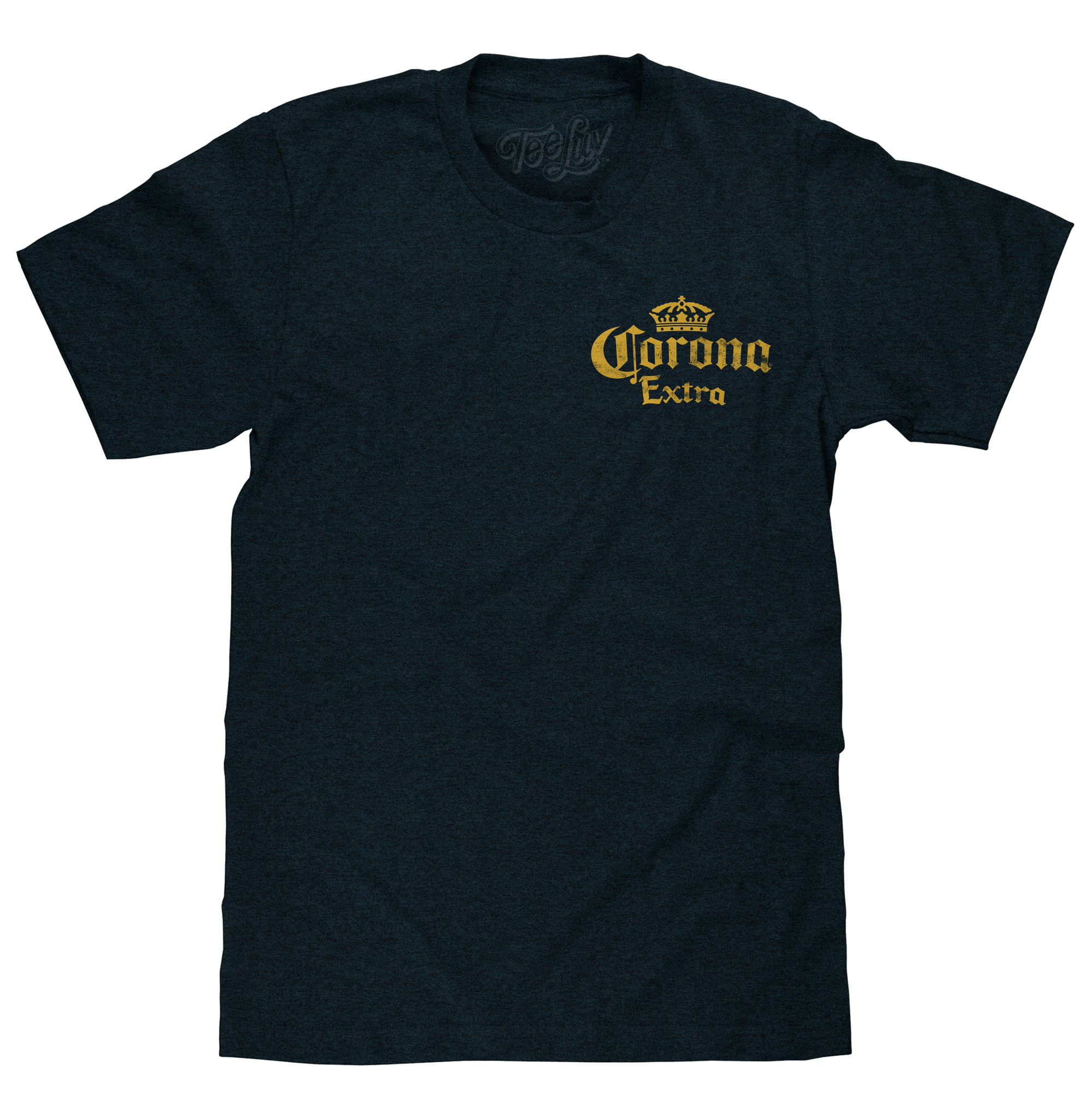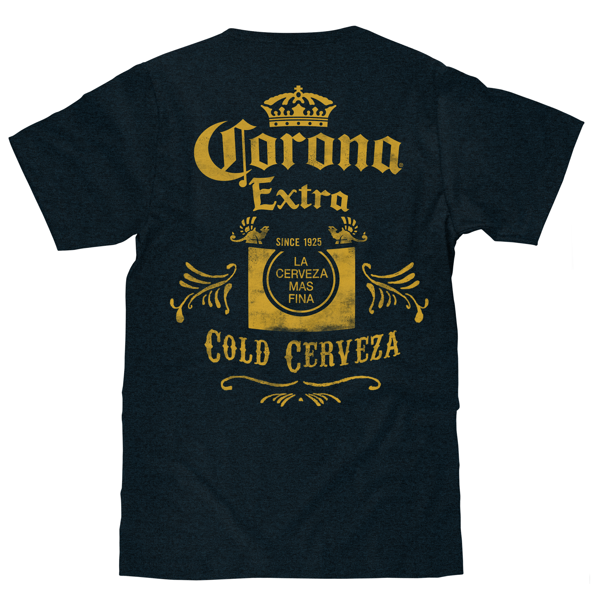 When it's time to unwind and raise a toast with friends - there's only one brew made for the moment! Inspired by those easygoing summer evenings, we've crafted this double-sided beer t-shirt featuring a small Corona Extra crown logo on the left chest. For the back, we selected a full sized version of the Corona Extra "Since 1925" logo complete with heraldic griffins and "Cold Cerveza" text. For some extra laid-back, vintage vibes - we've distressed the graphic and printed it on a soft, Denin Heather Black short sleeve tee.