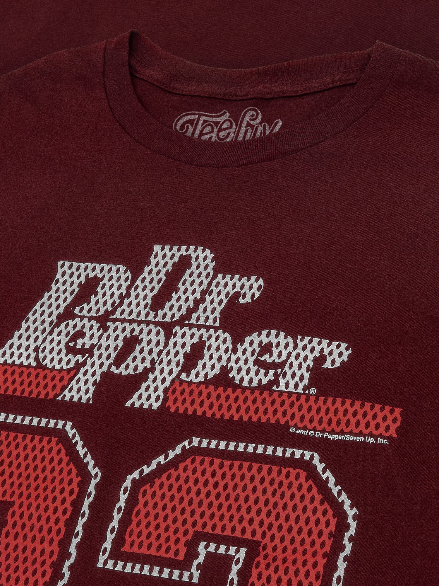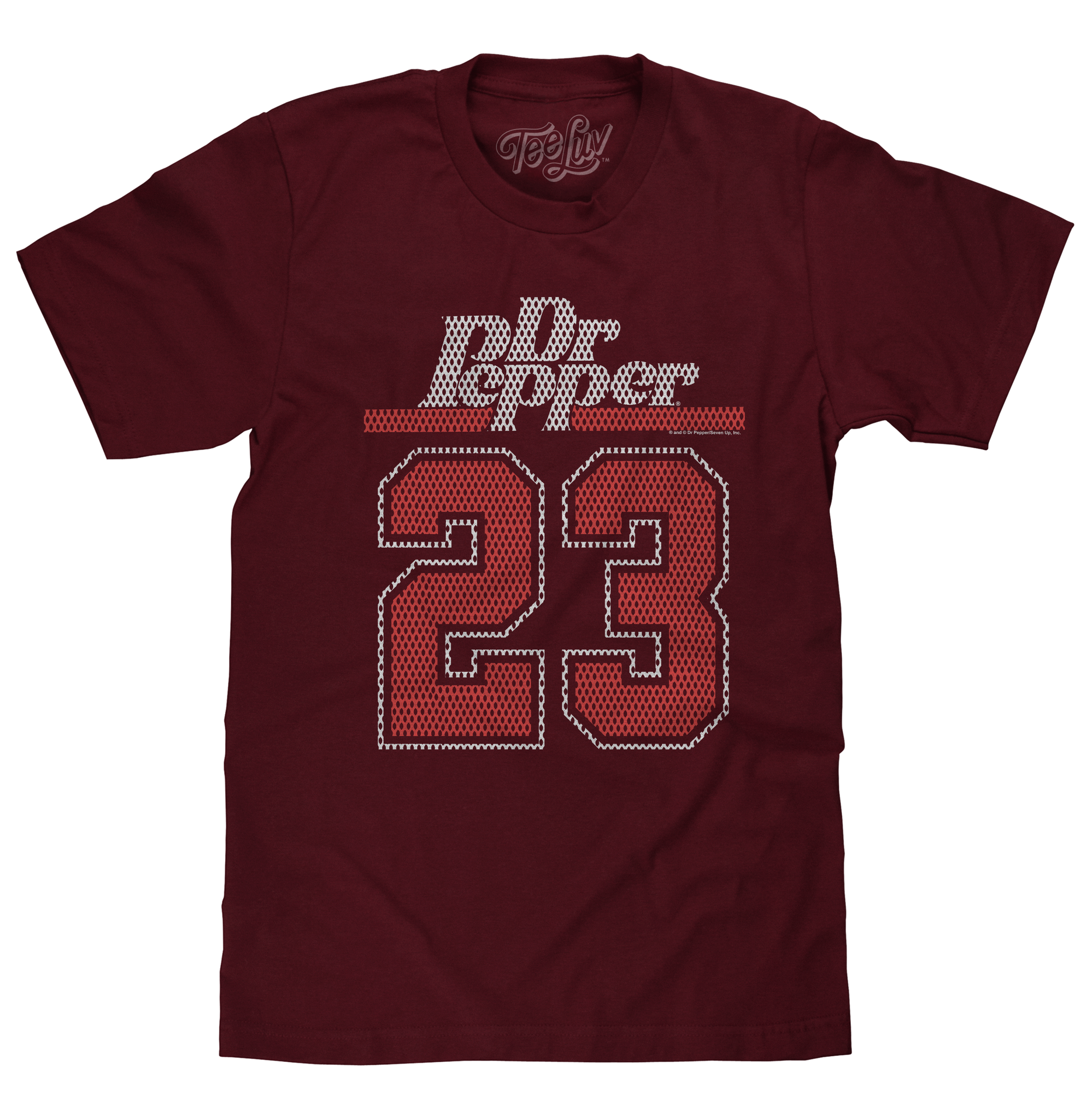 Bring some soda spirit to your wardrobe with this retro tee featuring the 80s Dr Pepper logo and a large sports jersey-inspired "23" mesh-styled graphic. To round out the varsity look of this soda pop t-shirt - the design is printed on a soft, burgundy cotton tee. With its old-school sports uniform style, this vintage Dr Pepper shirt is perfect for game days, tailgates, or everyday casual wear!