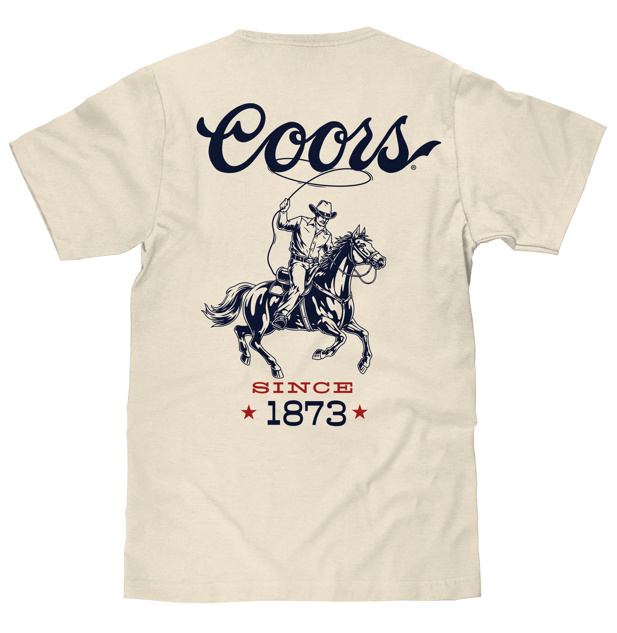 Coors and Cowboys go hand in hand - rugged, dependable, and unmistakably all-American! Inspired by the heroes of the West, the Tee Luv team crafted this rodeo themed graphic t-shirt with a subtle Coors logo on the chest. For the back, we added a bold print of a cowboy mid-ride with a lasso, framed by the classic Coors script logo and "Since 1873" text. To ensure that this Coors brewery shirt is ready for your next adventure - we've printed the design on natural beige tee, made right here in the USA.