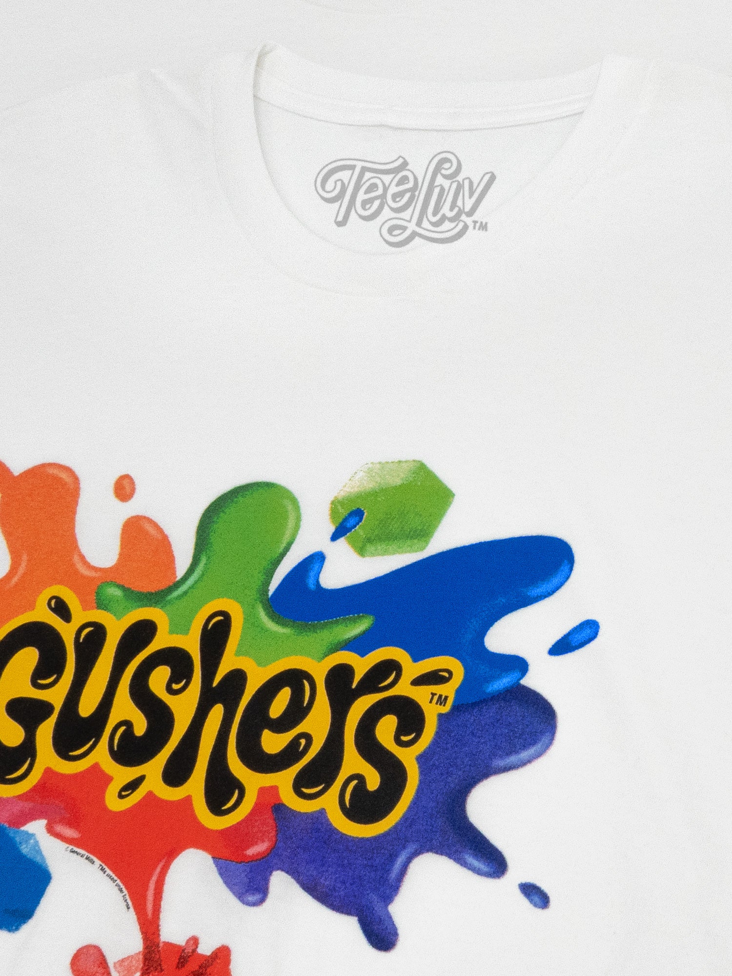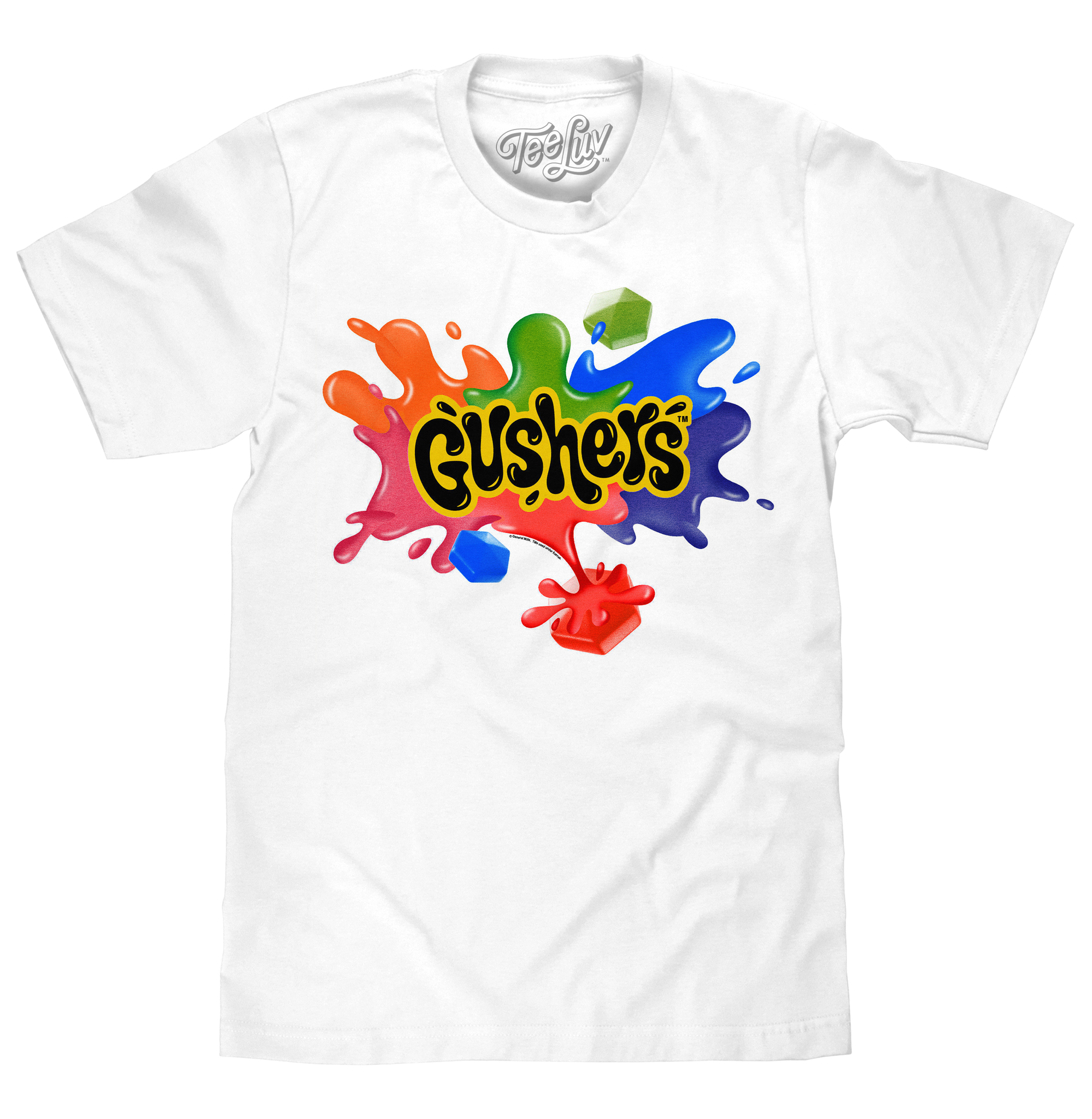 From savoring the sweet taste of Strawberry Splash, to taking your time with a pack of Tropical - the sweet, fruity explosion of Gushers candy is a core memory for an entire generation! This Gushers t-shirt is a bold tribute to the juicy treat that made a "fruit blast" a household phrase - featuring the colorful logo and its signature splash effect on a crisp white cotton tee. Perfect for reliving the glory days, without the homework!