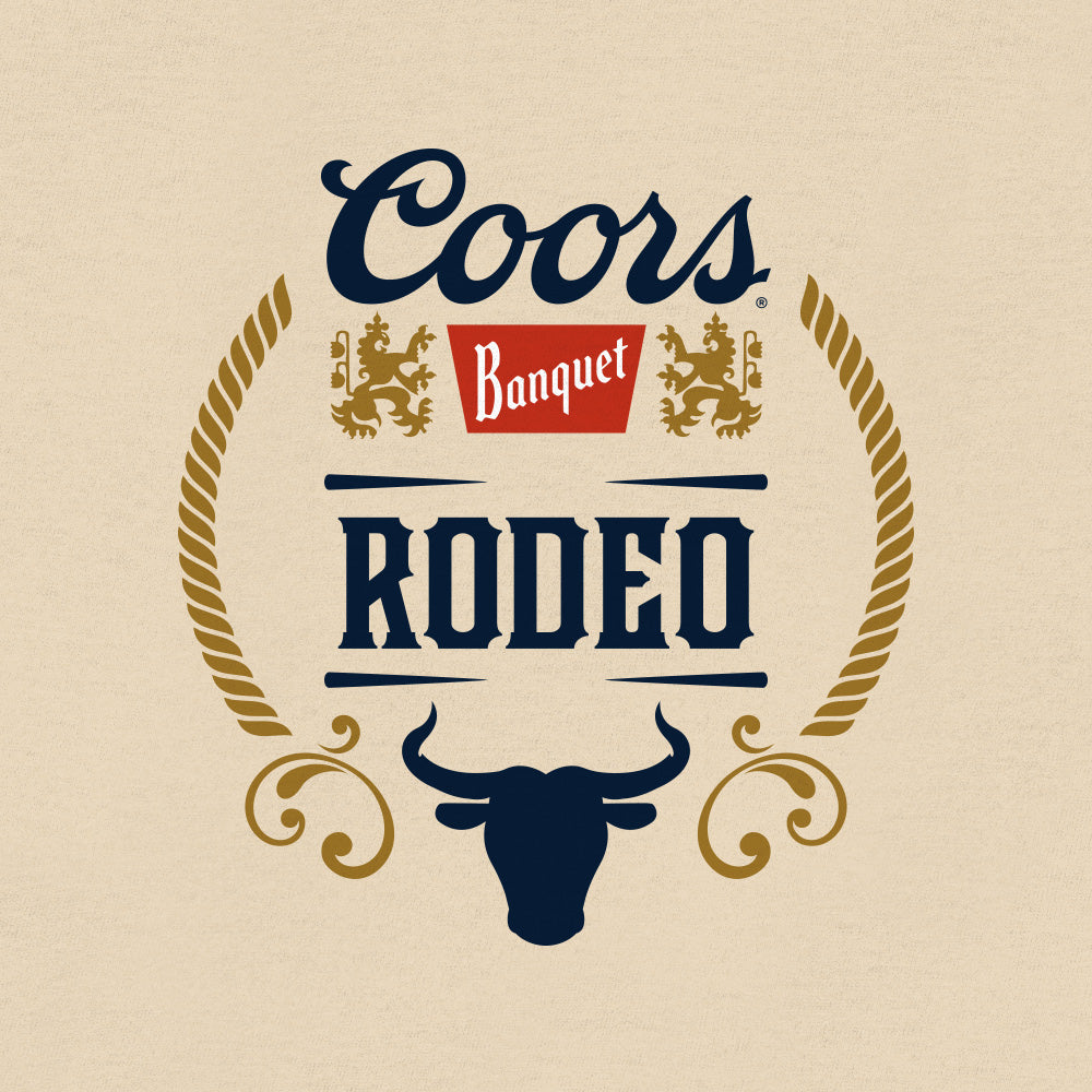 First brewed in Golden, Colorado in 1873 - Coors beer has become a symbol of the tough and adventurous spirit of the American West. It's no surprise that this brew pairs perfectly with Rodeo - a sport that demands toughness, skill and bravery! We've paid tribute to the rugged Coors brew, and the rough and tough cowboys that grab the bull by the horns with a double-sided beer shirt featuring the authentic licensed Coors Banquet Rodeo bull logo - printed on the left chest and back of a soft, cream cotton tee.
